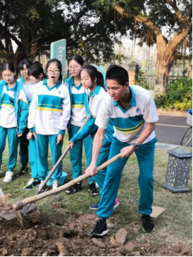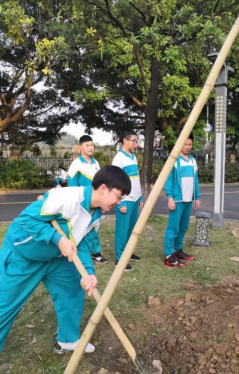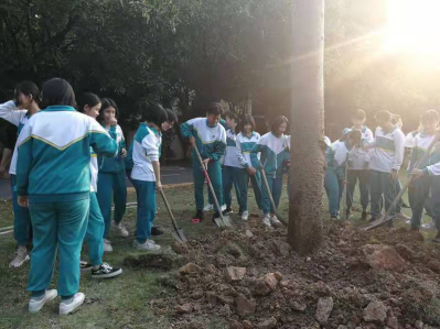 当天,三棵大木棉树被吊车植入土坑。下午,同学们手拿铁锹,为自己的木棉树培土浇水。傍晚夕阳下,大家劳作的身影和栽下的木棉一样,茁壮又生机勃勃。