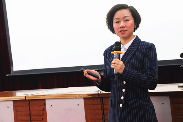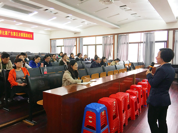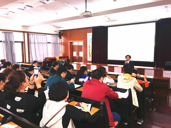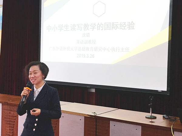 此次教研,小学高语组一改往日的圆桌会议,而是邀请行内大咖进行讲座。主讲嘉宾沈露,是广东外语外贸大学英语副教授,曾任我校副校长,现任广东外语外贸大学基础教育研究中心执行主任。作为我校英语教学方面的带头人,沈主任对西方的基础教育教学的了解颇深,有着与国际接轨的先进理念。而恰逢国家统编教材实施在即,沈主任此次作客小学高语组进行讲座,对于帮助小学高语组的各位老师解决心中困惑,可谓是一场及时雨。