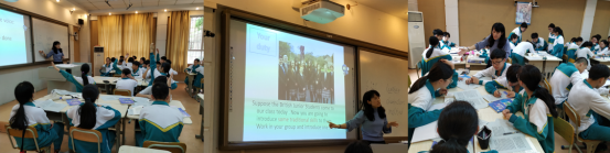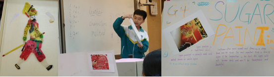 即便王老师的课安排在第五节,远程教室也座无虚席。不仅是初英组全体老师到场认真学习,连其他科组的老师也纷纷前来聆听。在上课前,我们已经能看到围坐的小组座位整齐地摆放好,可见通过小组合作促进同学们用英语交流在王老师的课堂是必不可少的。在课堂导入部分,王老师巧妙地设置了与外国交换生交流的情境,让同学们建立真实的交流。随后,王老师给同学们展示了中国传统剪纸、糖画、中国结以及皮影戏的图片。这四种传统技艺均出现在同学们正在学习的第三单元话题里,可见王老师的课非常重视单元话题教学整体性。为了拉近学生与皮影戏的距离,王老师在课堂上展示了真正的皮影戏模具,并且播放了岭南印象园的皮影戏表演视频。引入点到即止,让学生对似乎遥不可及的皮影戏有了立体可感的认识。