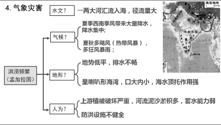 吴婷老师上南亚复习课所用的一张幻灯片:洪灾的成因思维导图