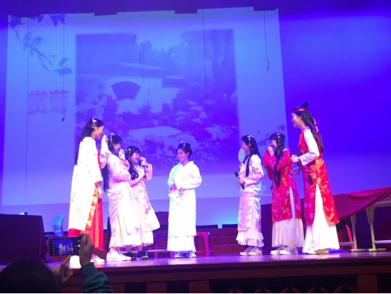 诗词歌赋、生旦净末、舞蹈武术、书法绘画……好看的节目是九个,还有我们的“李白”要来收尾,所以,圣音社好看的高一小姑娘给我们带来了好听的《李白》。