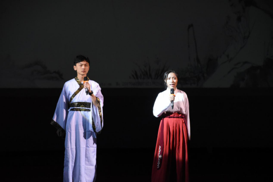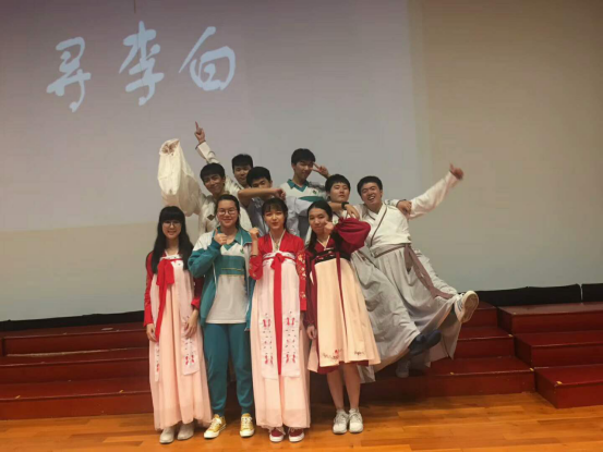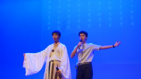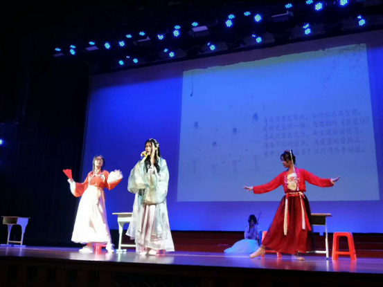 当帷幕开启,六位身着汉服的主持人华丽亮相,瞬间俘获台下雷动掌声,外校学子正式奏响诗与歌的春之声。诗是歌,歌即诗,他们诵、她们唱,他们扮、她们演。剧、曲、舞夹杂其间,高一学子群嗨群乐,玩得不亦乐乎。