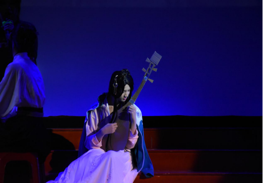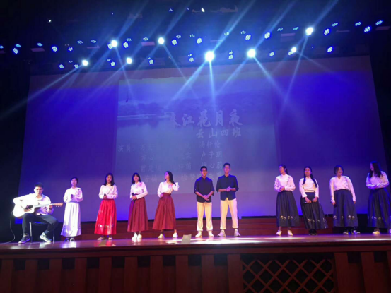 ↑云山5班吟诵《琵琶行》,将文人骚客白居易和风尘女子琵琶女的奇迹相逢,演得真切动人。特别是反串女角的男生抱着琵琶羞怯怯半遮面的造型,似一颗火星,如一颗手雷,把现场炸得沸腾。