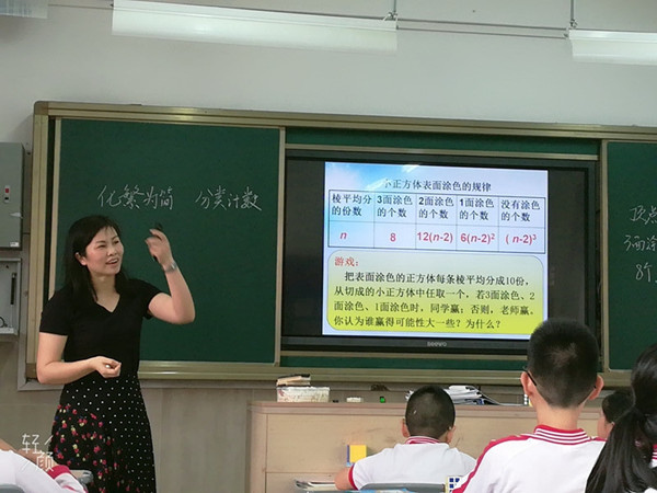 本节课教师的导、放、扶层次分明。整个教学过程老师作为组织者、引导者帮助学生参与学习过程,发挥了引的作用。张老师通过复习长方体和正方体的有关知识的进行引入和铺垫,激发了学生探索新知的欲望。教学中放手让学生自主动手操作、推理、归纳、总结等一系列教学活动,引导学生总结出三个面涂色、两个面涂色、一个面涂色以及零个面涂色的规律。通过师生互动、生生互动,圆满地完成了本节课的教学任务,收到了良好的教学效果。