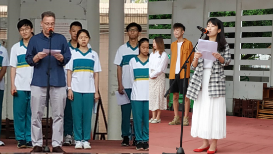 之后是初中英语组教研组长王佳琼老师的英文发言。王老师向在场师生抛出一个问题“如果你能带一样东西去外太空,你想要带什么?(If you can take one thing to the outer space, what would you like to take with?) 有别于金钱,王老师回答她想带一盒用七国语言录制“我爱你”的录音带上太空。因为她觉得语言是你给别人灌输思想最强大的武器。王老师还强调,掌握两种或多种语言的人比只会一种语言的人更能胜任繁复的工作。正如外教Andrew提到世界已经成为地球村,王老师也提到世界的全球化趋势不可逆。外校学子坐拥丰厚的外语学习资源,必须把握机会,在平时努力学习外语,在外语节享受外语学习!