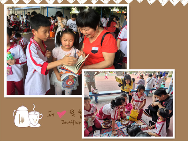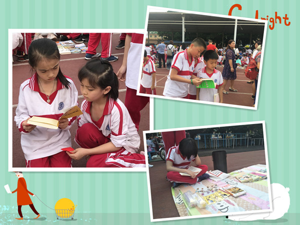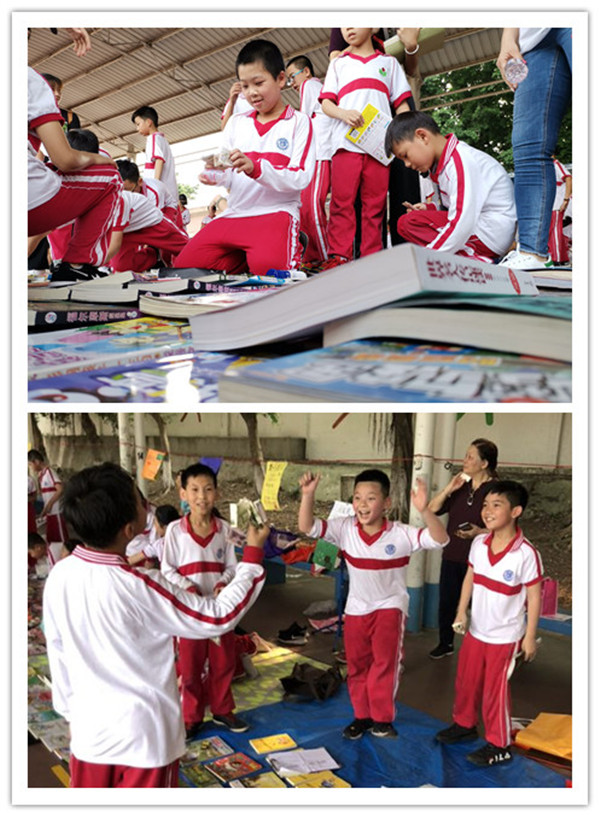 愉悦的时间总是过得特别快,活动已接近尾声,各班书摊所剩无几,每个学生都收获满满,可孩子们还久久不愿离去,三五一群,有的在向同学展示自己换到的新书,有的干脆席地而坐,聚精会神地阅读刚淘到的宝贝。