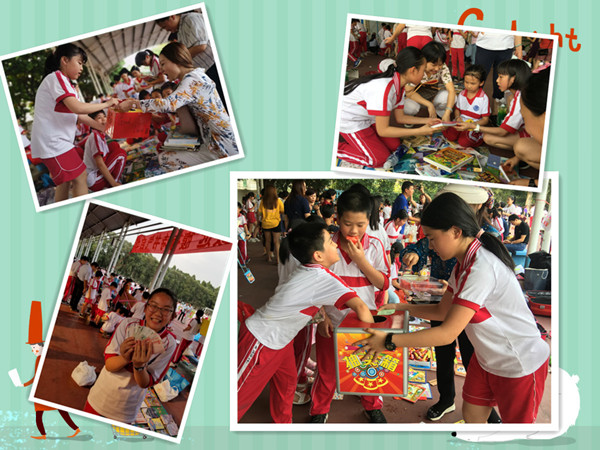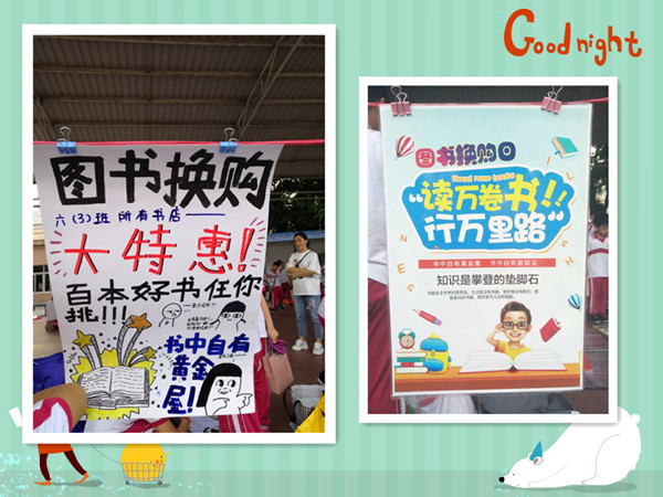 在图书交流中,各班同学都大展才能,积极向老师和同学推荐自己的书籍,并写了各班的宣传口号,绘制了独特而又朗朗上口的广告牌,想到一句句妙趣横生的广告语,很多班级还融入了课程元素,既有数学中的盈利率,又有语文中的读书方法指导,还有美术的熏陶,更有实践课程的加入……一次图书的换购,让学生有多元的收获。