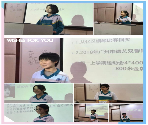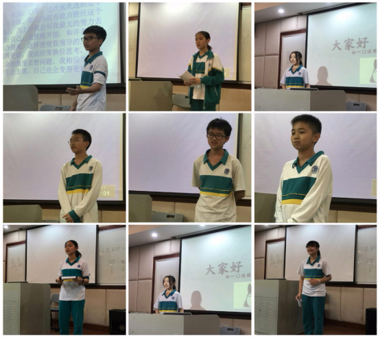 在大赛开始的时候,39位选手全部准备就绪。先是由曾勇老师讲了一段精彩的开场白,为同学们加油打气。前几位选手落落大方地走上讲台,自信地演讲着,向同学们展示着自己的风采,为后面的竞选者打好榜样。轮到谈梓茵同学,当她准备使用ppt演讲时,显示屏突然变蓝。曾老师上前修理,竞选信息技术部的金禹彤同学积极地帮助老师,但并未修好。这让同学们大吃一惊,但是这并没有影响竞选活动,不用ppt的同学一个接一个的上前演讲,使空气中不会弥漫着尴尬的气氛。虽然这些同学并没有制作ppt,也并不影响口才,能看出这都是精心准备的。等这些同学讲完后,发现大家都是卧虎藏龙:有执政班长长达七年的江晓蕾,有学霸刘玥仪,有擅长版面设计的黄思瑶,有精通建模与编程的金禹彤,有擅长舞台策划、文艺节目编排的南思睿,有江门注册“老义工”谈梓因……