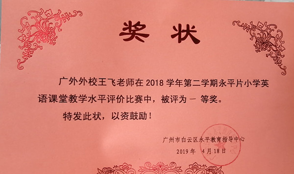 2019年4月,小学部高英组王飞老师参加白云区永平片小学英语教学水平评价获得,荣获一等奖。王飞老师以风趣幽默的教学风格,扎实的教学基本功,得当的教学方法,良好的教学效果,赢得了评委的一致好评。