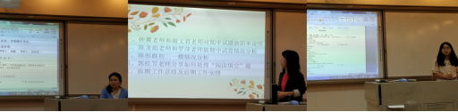 会议的第二个环节是三位备课组长对期中考或一模成绩进行分析。首先是初一备课组的陈龙娟老师发言。陈老师跟大家明确,这一届初一学生面临的是中考的改革,英语考试总分从150分变为120分。在初一这个从小学到初中的过渡性阶段,我们的期中考试依然保留着传统的语音题、单选题、听力理解以及听力回答问题这些题目。尽管钟翼老师提到她在批改初一年级期中考作文时觉得初一学生的写作水平比她们初二的学生当时读初一时的要好,但陈老师还是提醒我们初一的老师们不要沾沾自喜,我们要清楚自己学生的写作水平如何,还是要提高他们的写作能力。陈老师还提到,语法选择和完形填空的难度系数会随着篇章的变化而改变,因此这两项得分较高的班级的老师不要掉以轻心。听力回答问题以及阅读依然是学生们的弱项,我们要着重加强对这些题型的训练。陈老师还总结了初一年级各分数段人数,要求初一备课组老师要重点关注学习态度好的同学去帮助他们。而对于70分以下的同学,我们也不放弃,要尝试多种途径去让他们有所进步。