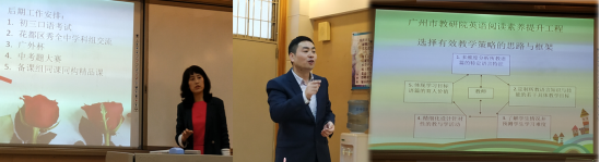 会议的第四项是教研组长王老师给我们做本学期前期工作的总结。会议前面的信息繁多,而且将近午饭时间,老师们难免疲倦。可是王老师别开生面地将我们前半个学期的工作照片制作成了音乐视频播放给我们看,让在场老师在优美的音乐中回味自己对工作的付出,精神放松之余又增强了大家对彼此工作的认同,增添了团队的凝聚力!对于后期的工作,王老师提醒初三组老师要落实好听说考试工作,全体老师要做好与花都区秀全中学科组的交流。今年的广外杯除了广外教育集团的学校参赛,还有另外两所集团以外的学校参加,辅导老师们要加把劲指导学生。全体老师要做好中考模拟题比赛的出题准备。各备课组要继续推出同课同构精品课。