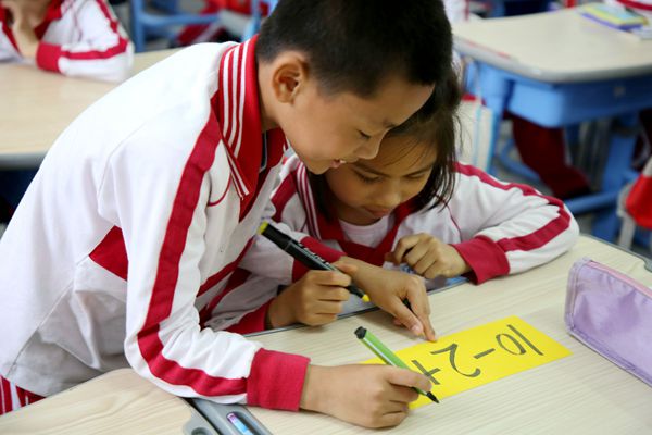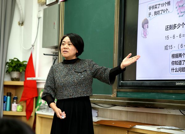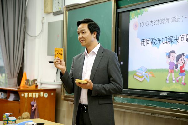朱老师《认识小括号》的课不走寻常路,没有让小括号赤裸裸的直接出场,而是带领孩子们经历“创造”小括号的过程,理解小括号的意义和作用,产生认知上的冲突,感受引入新的符号的必要性。朱老师说:“10-2+3,请你和同桌合作创造一个符号,可以先算2+3”,孩子们兴致盎然,积极思考,热火朝天的动手操作起来,不一会儿,“小括号”就隆重登场啦!自己“创造”的符号就是有优先权——括号里的要先算!这节课的重难点于欢乐中不攻自破。