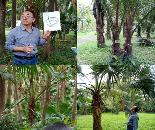 接下来,我们来到了棕榈园。棕榈科又称槟榔科,这种植物多为单干直立,叶子多集中于树干顶部,且多为掌状分裂或羽状复叶的大叶。砂糖椰子,蒲葵,三药槟榔,琼棕,鱼尾葵便是属于棕榈科植物。其枯叶易脱落,叶柄基部常扩大成纤维质的叶鞘,韧皮纤维为死细胞。同时,老师也给我们划出了椰子的内部结构图。