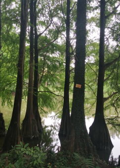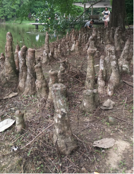 然后我们到了孑遗植物区,孑遗植物也称活化石植物,多种中国特有的孑遗植物为国家重点保护的一、二级濒危物种。多种孑遗植物为裸子植物,而“鹅掌楸”属于被子植物,叶子形状极似马褂,被称为“马褂树”。笔筒树与落羽杉为华南植物园中孑遗植物的代表。而笔筒树又属于蕨类植物。落羽杉都为高大乔木,花(实际不是花)为孢子叶球,雌雄异花,同株。落羽杉的气生根生长于地面上,为呼吸根,有帮助植物通气的作用。