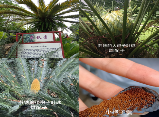 最后,我们来到了苏铁园,苏铁的叶片呈角质,比较坚硬由于其根系并不发达,在当年气候条件下,光照强,所以表变呈蜡质,可以降低水份的蒸腾作用,保持充足水分。苏铁是一种雌雄异株的植物,分为小孢子叶球与大孢子叶球。小孢子叶球由小孢子叶组成,小孢子叶内面有小孢子囊,小孢子囊中有小孢子,即花粉。而大孢子叶球由大孢子叶组成,下边会长几个胚珠,受精后将会长成种子。老师说,我们来得正是时候,可以看到很多大小孢子叶球。