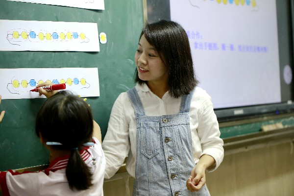 邱老师精心设计的“解决问题”课堂为孩子们营造对话的空间,解读题目给孩子们搭设思维碰撞的平台,串珠子给孩子们提供实践操作的机会,促进孩子们创新思维的发展,帮助他们积累数学活动的经验,邱老师读懂学生,提供学生尝试体验的过程,阐述自己的观点的机会,引导孩子们“发现问题—解决问题—体验成功—增强自信”她的课充满了童趣,乐趣。课伊始,趣已生;课继续,情更生;课已完,意未尽。《找规律解决问题》这35分钟的课堂,像磁铁一样把每一个孩子的心紧紧地吸在一起,把时空有限的课堂变为人人参与、个个思考的无限空间。