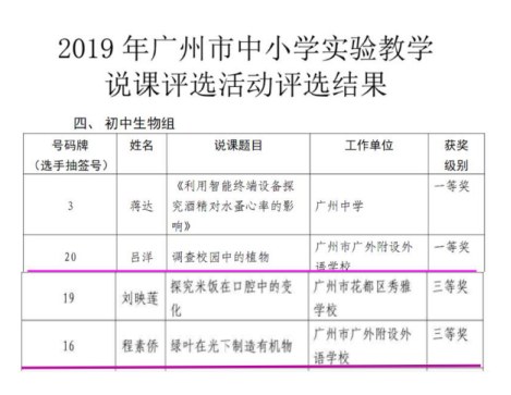 5月25日,由广州市教育局主办,市教育基建和装备中心、市教育研究院承办的2019年广州市中小学实验教学说课评选活动终审在广州大学(大学城校区)举行。我校初中生物吕洋和程素侨老师通过微课视频初选,获得终审参赛资格,两位老师现场说课清晰流畅,实验创意新颖,分别获得市一等奖和三等奖的好成绩。