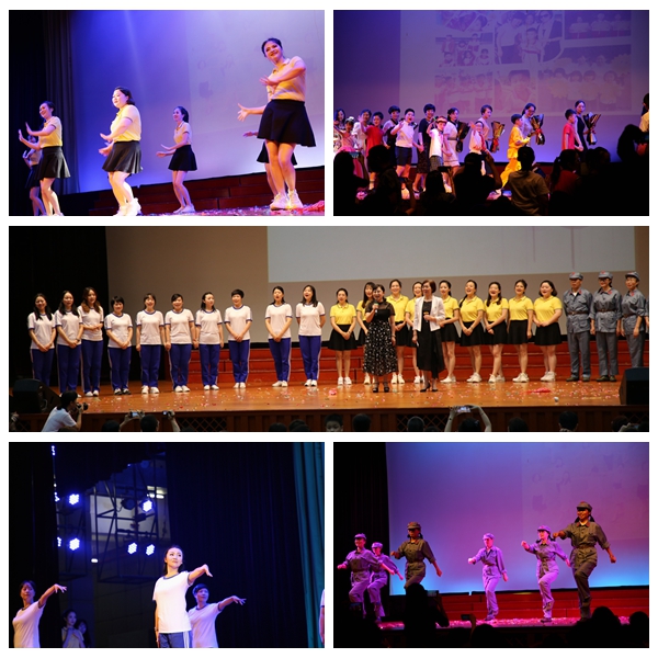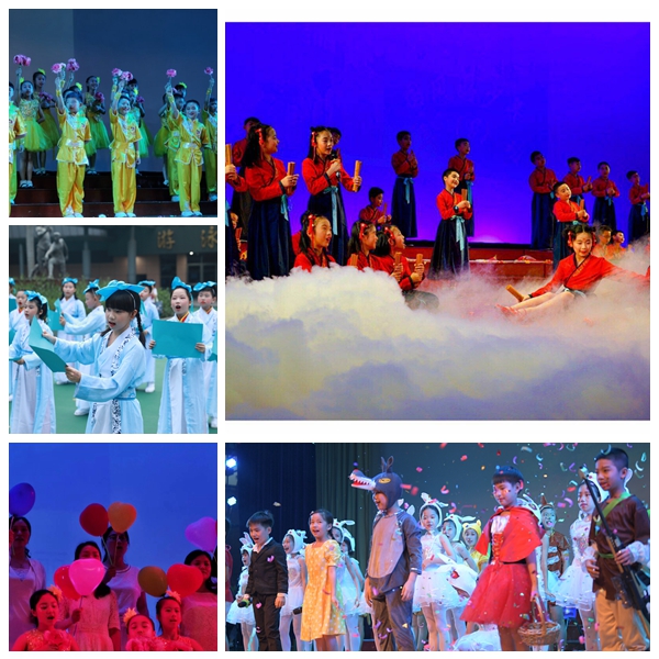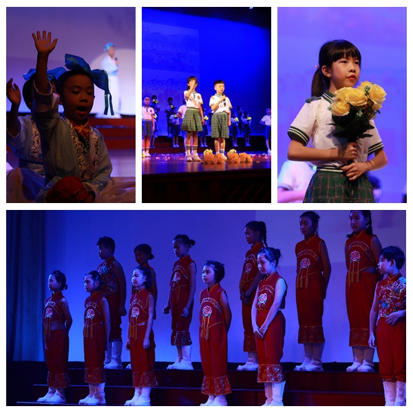 每个节目那么精彩,服装、音乐、灯光、道具、台词、动作、队形以及小演员们的表演配合的那么完美!借用一位来现场的妈妈在微信“朋友圈”里的留言“ 以文为主线,采用情景剧、音乐剧、舞台剧的首发,展现老师们创新教学、学生们孜孜以求的剪影、阶段性成果及愿景!”,可见节目的内容和形式多么的丰富和丰满!