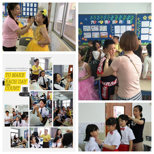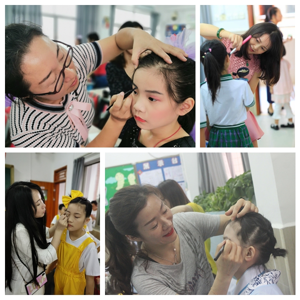 其实在这精彩的背后也凝集着所有家长的辛勤付出,从家长们自发提供一些幕后工作的资源,并且分工明确,有专门负责测量学生身高,有专门负责订制服装,有专门购买道具,有专门购买化妆品,有专门负责学生化妆等。30日晚上五点,三年级的学生家长大部分都到齐了,在教室里为学生登台表演节目做最后的准备。教室里忙碌的家长们井然有序,看着衣着鲜亮,妆容精致的孩子们,老师们和家长们心花怒放,这一切都是因为一个字“爱”!