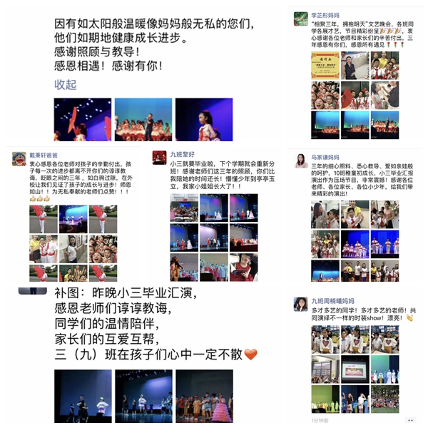 三年级小毕业汇报演出已经圆满落幕,但我的心久久不能平静,晚会从看校电视台为孩子们制作的三年来的纪录片开始,让我们的思绪回到三年前,看到了一群天真无邪的孩子们在外校的成长点滴,那里有一群无私奉献的老师“妈妈”在时刻关爱着他们,是她们陪伴了这三年的大部分时光,感恩外校,感恩老师,晚会上看到了每个班每个孩子的表演,非常精彩!他们人人都是主角,每个孩子都有自己的闪光点,也正是外校用最先进的教育理念和方法使每个孩子茁壮成长!相信孩子们在今后的学习生活会越来越好!
