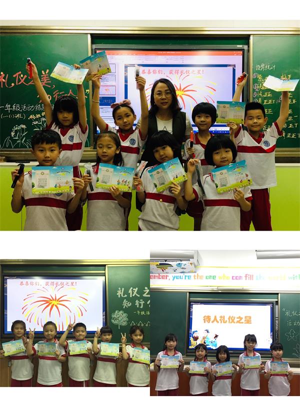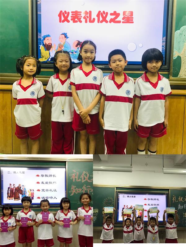 在此之前,我们每周都开展了不同礼仪主题的班会,对学生的礼仪行为作出相应的要求;并专门制定了评价表,发放《礼仪争章卡》,根据每周的礼仪标准,由小组长对组员实施监督、评价,教师具体指导,一周汇总一次,达到要求就能得到相对应的文明星,在班级树立榜样,给其他同学做出表率。