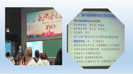 上海市浦东新区语文学科带头人廖飞老师给我们带来了《初中整本书阅读课程化实施路径》专题讲座。他从整本书阅读课程化的长效机制建设谈起,倡导把阅读空间打造成学生的天堂。他以课程统领的方式,分年级分层级拟定课程目标,从激趣与习惯(六年级目标)到情趣与速度(七年级目标)到方法与积累(八年级目标)到读写与思辨(九年级目标),最终指向批判性思维培养。下午,廖飞老师亲身示范了《水浒传》导读课,通过“看一看”一句话图说故事,熟悉故事情节;通过“想一想”给最喜欢的人物思维导图评分,读懂人物个性;通过“辩一辩”少年该不该读《水浒》的情境活动,在正反方辩论的过程中,引导学生走向阅读的深水区即主题思想,从而实现思维力的提升。