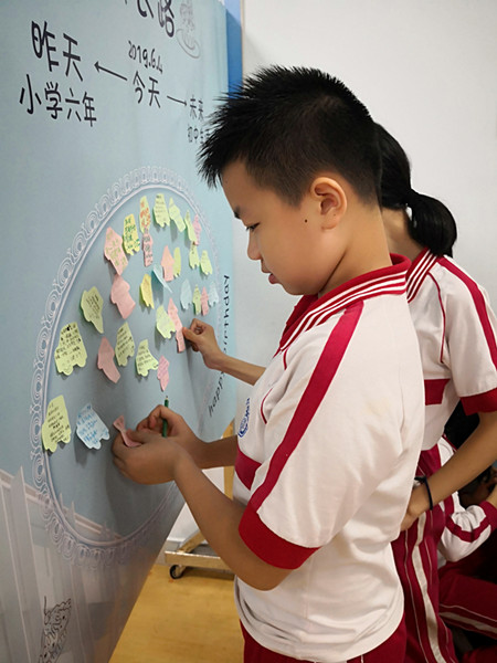 第一个分享的是赖炳宪同学,他说,对于今天,我选择的是“翱翔”,那是因为这学期我在知识的海洋中翱翔,学习了很多知识;对于昨天,小学六年我选择的是“欣喜”,因为经过自己六年的努力,在今天取得了比较高的成绩,感觉很欣喜;对于未来的初中生活,我选择的是“带领”,因为是希望自己有成为领袖的风范与能力。