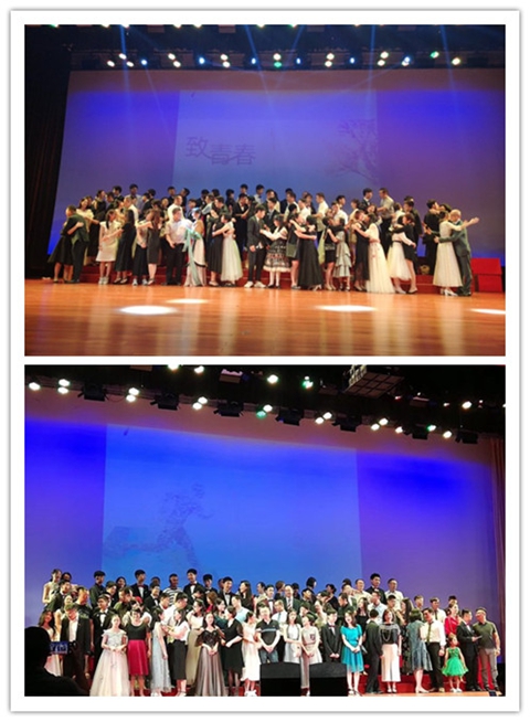 灯光变暗,每班两位的学生代表们也在舞台上站好了位置,拿着写着“青春”字样的气球,随着音乐翩翩起舞。在同学们或磅礴有力或柔美动人的舞姿里,我们都感受到了属于青春的活力与朝气。