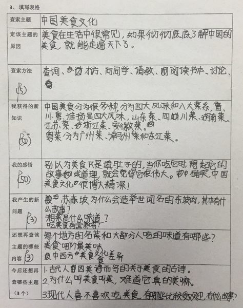 在短短一个学期的查索活动中,同学们初步学会了运用百度搜索、查阅工具书、与他人交流等获取信息的方法,并懂得了如何整合信息资源,提炼有价值的信息,最终内化成自己的独到见解。谈起查索活动的收获,郭子尧同学抑制不住激动的心情,说,“如果查索活动是一起愉快的旅行的话,那么,就让我们向着快乐出发!”