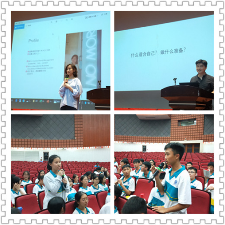 2018届毕业生刘家泰同学,现就读于英国杜伦大学金融学专业。他以“把握方向,做足准备”为主题,分享了他在高中阶段的学习成长经历。他首先分享了他选择出国读书和专业选择的心路历程,他在高中阶段积极参与学生活动,通过活动尝试中发现自己的比较优势,发现什么更适合自己,并以此做出了求学的方向选择。他还以自身积极打牢英语基础,在高一下学期就取得雅思6.5分的的经历告诉大家:不论你是否有明确的目标,都要为未来的各种可能做足准备,不论是高考、保送、出国,尽最大努力学好英语、学好各科基础知识都是必要的的。在互动提问环节,刘家泰学长热情的回答了同学们提出的“个人兴趣和家长期望的矛盾”、“英语雅思学习和其他功课学习的时间冲突”、“参与活动意义与自身体会”等问题,用自身的理解给予了同学们有益的参考。
