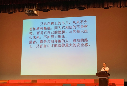 大会第一项,“回首来时路”,李主任邀请两位外校校友和高二同学们分享自身成长的经验,并对同学们即将到来的高二生活给出了好的建议。