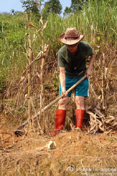 这个小组的三位同学在刨地,其中一位同学戴着草帽,手拿四齿钉耙,脚穿红色水鞋,哥,辛苦了,您在干啥子噻?