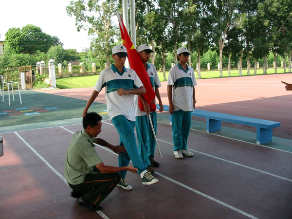 国旗班是队伍的排头兵,能够进入国旗班是一种崇高的荣誉。组成国旗班的是高一的同学,他们入选是因为他们在军训中有出色表现;即便如此,他们的训练也从不懈怠,甚至比其他同学更加认真、更加辛苦。教官们严格规范他们的一举手一投足,手把手地教,反反复复地练,直到把他们训练成为一支出色的队伍。