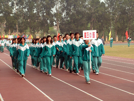 入场式上,教师方队引人注目,这些平时严谨认真的老师,除了担任运动会的裁判工作外,还要充当运动员,参加他们自己的趣味运动项目。 开幕式上,学校腰鼓队也来助兴。