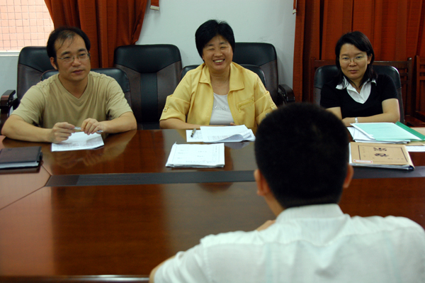 校长刘世平(中)、副校长王秀民(右一)、中学部主任孙传华(左一)及相关人员与中学部应聘老师见面。我校2006—2007学年度新教师招聘集中面试工作于今天上午全部结束。