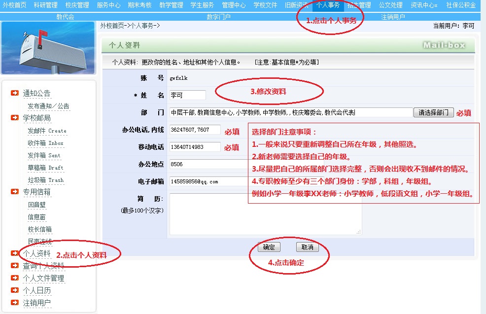 新学期好!学校办公室要着手制作本学年的校通讯录了,本学期是2014-2015学年的第一个学期,老师们的各项工作、办公地点、办公电话(个人电话)都有变动。为了保证校通讯录能尽快、准确的完成,请所有老师务必在9月3号前完成信息更新!操作演示请查看附件,谢谢配合!