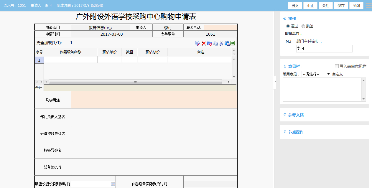即日起,学校所有采购申请单都通过OA办公平台进行网上申报,具体申报方法如下:
