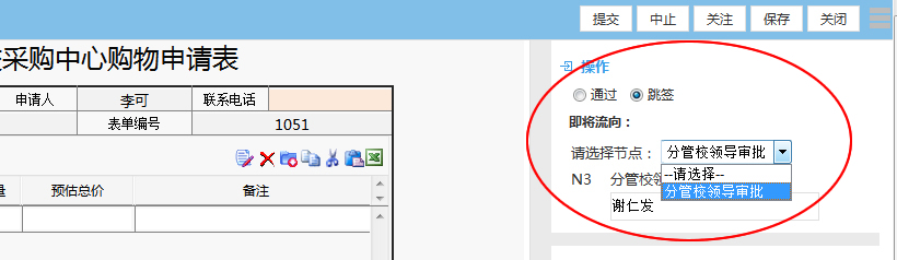 注:正常情况下直接点击提交按钮,如果部门的中层干部外出不方便签字,可以点击“跳签”按钮,由部门分管校长签字。
