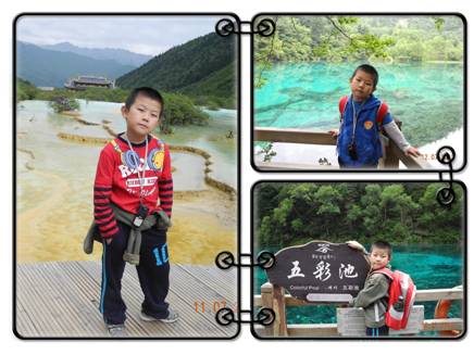 先来说说“五花海”吧,它是九寨沟的精华,如果你去九寨沟不去五花海就等于没来过哦。最奇特的是五花海的水是五彩缤纷的,你能说出的颜色全都有:水底生长着不同姿态与色彩的水草,它们随着水波荡漾,小鱼在之间快乐无比游戏着。有些树横在水底,有的树枝上又长出别的植物,真是太不可思议了!蓝天上的白云和青山上的枫树的影子也在水面上对我微笑着!我和妈妈在那里拍了很多照片,怎么拍都要美极了,各个角度有各个角度的韵味。